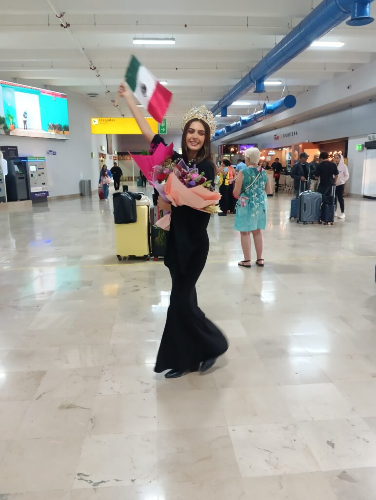 Ante la admiración y extrañeza de los pasajeros que en ese momento bajaban también de los aviones, Ruslana mostraba el gusto que le da haber participado en el concurso y explicó que la corona alcanzada es de Miss México, “estoy representando a Miss México, y reina internacional del Café 2026”.
