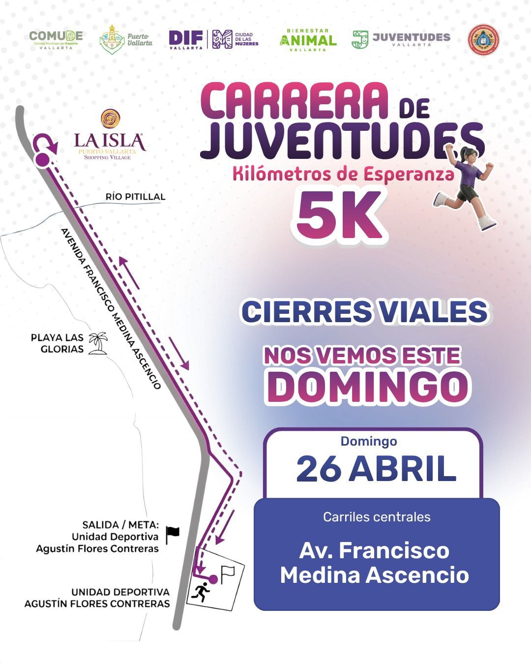 Este domingo 26 de abril se realizarán cierres viales por la primera edición de la “Carrera de Juventudes Kilómetros de Esperanza”, organizada por el Sistema DIF de Puerto Vallarta y el Gobierno Municipal a través de la Comisión Edilicia de Recreación y Deporte.